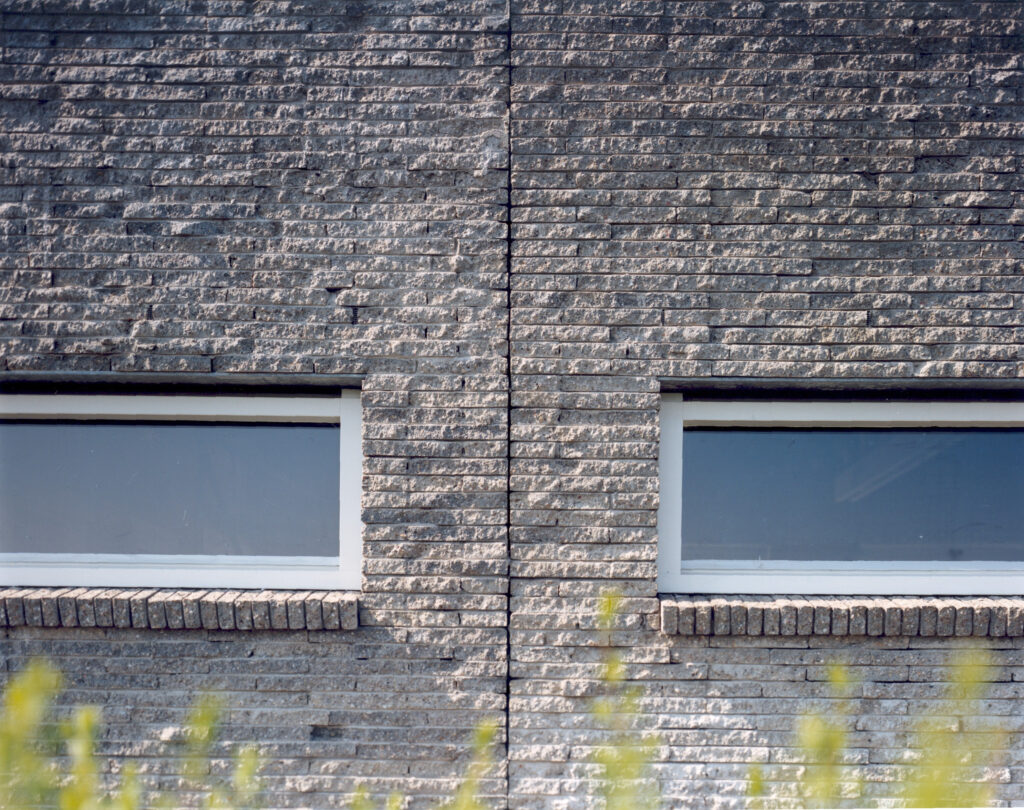 Het clubgebouw van Rugby Club Groningen op Sportpark Esserberg is ontworpen als een robuust, bijna fortachtig volume dat duidelijk aanwezig is in het open veld. Het rechthoekige gebouw van 24 bij 10 meter combineert een functionele indeling met een uitgesproken materiaalgebruik. De gevel is opgetrokken uit circa 10.000 hergebruikte betontegels, wat het gebouw een stoere, ruwe uitstraling geeft en aansluit bij de identiteit van de rugbyclub. De terugliggende plint en lage, brede gevelopeningen versterken dit beeld en geven het clubhuis een krachtige, bijna verdedigende uitstraling. [architectenweb.nl]